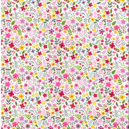 White and pink floral print 100% cotton, wash at 30 degrees and do not tumble dry.