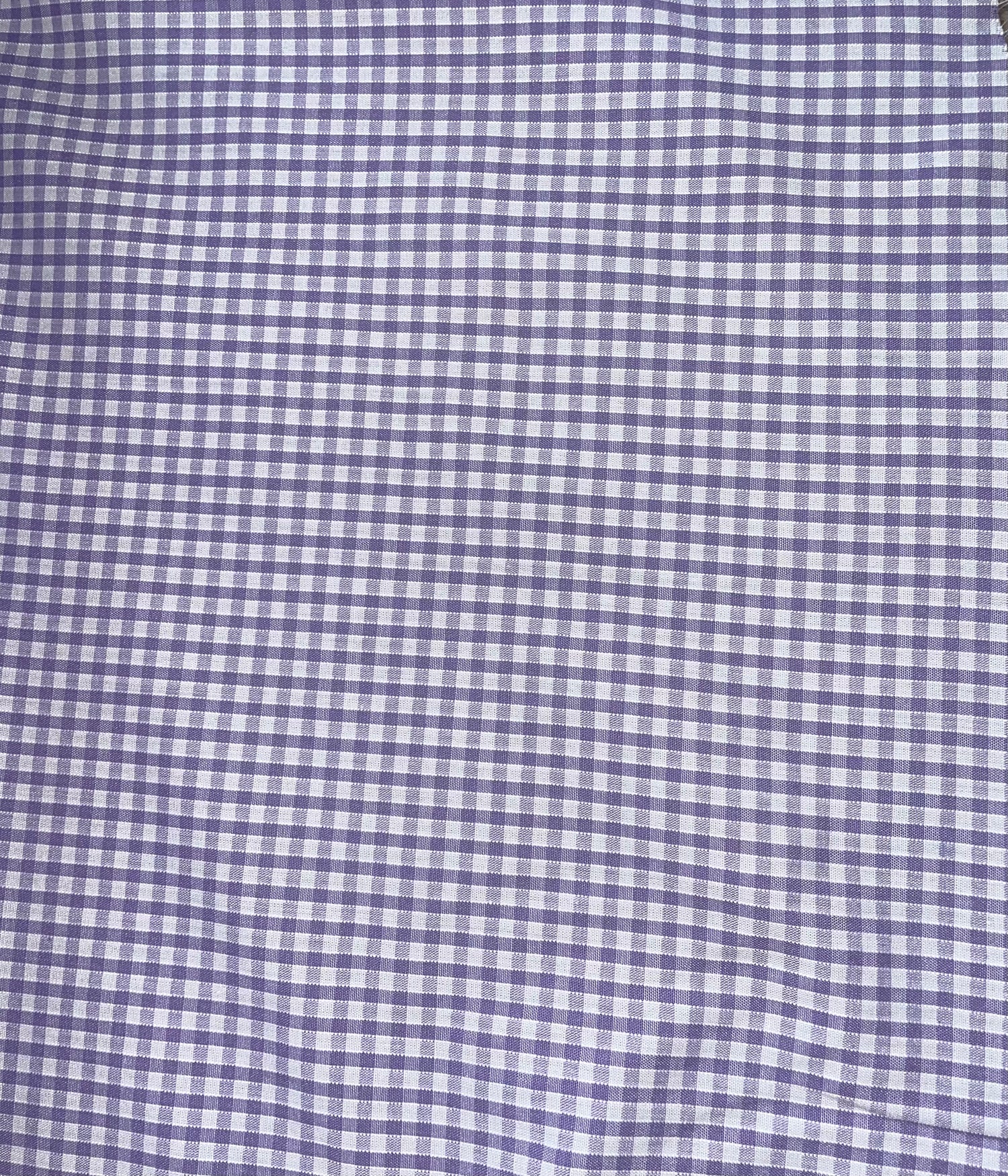 Small check purple gingham it is 65% cotton and 35% polyester, wash at 40 degrees and do not tumbel dry.