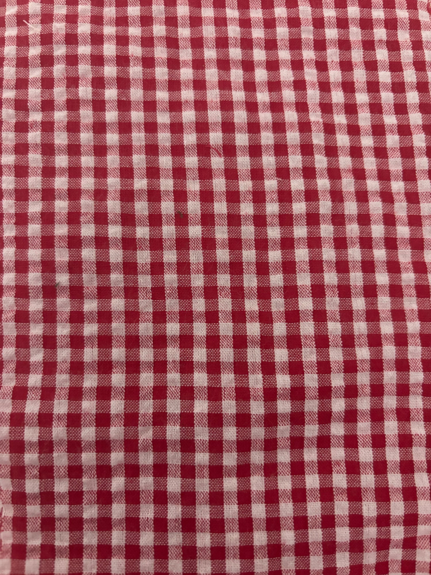 Red gingham with a seersucker finish it is 65% cotton and 35% polyester, wash at 30 degrees and do not tumble dry.