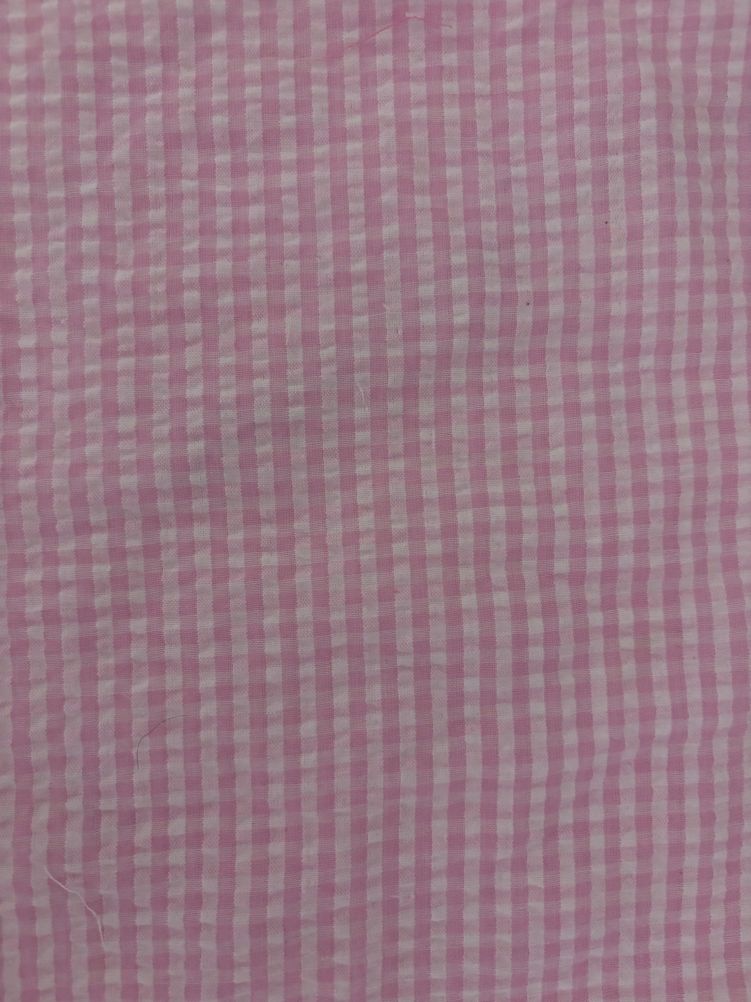 Pale pink gingham with a seersucker finish it is 65% cotton and 35% polyester, wash at 30 degrees and do not tumble dry.