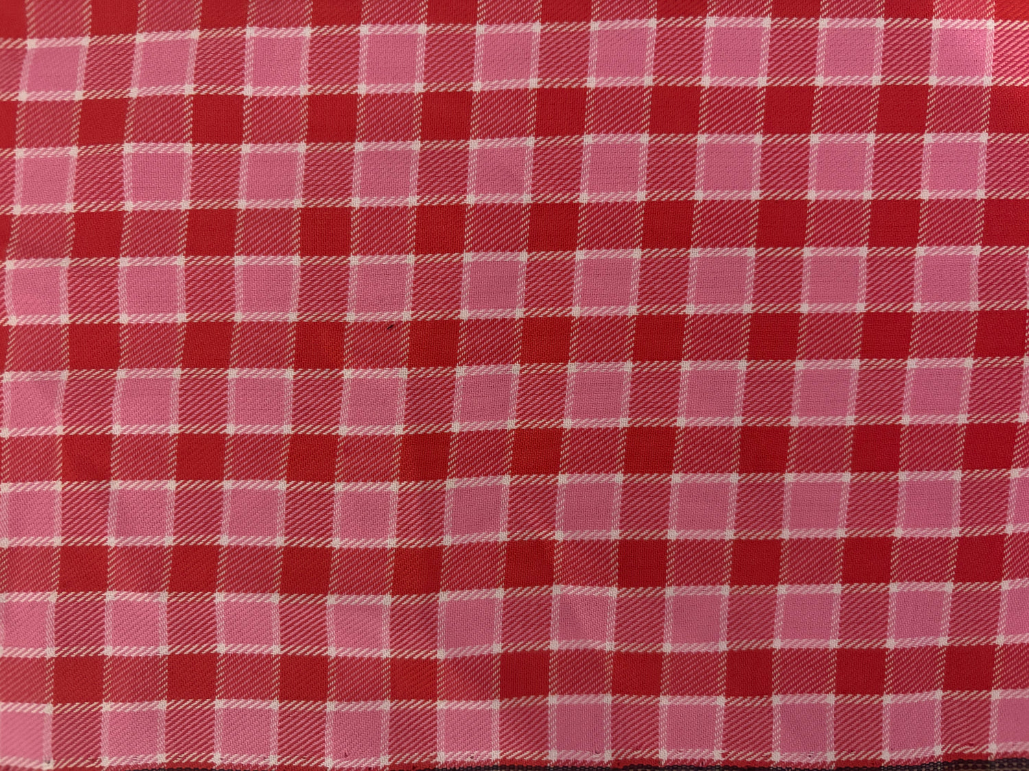 Red and pink check is 65% cotton and 35% viscose, wash at 30 degrees and do not tumble dry.