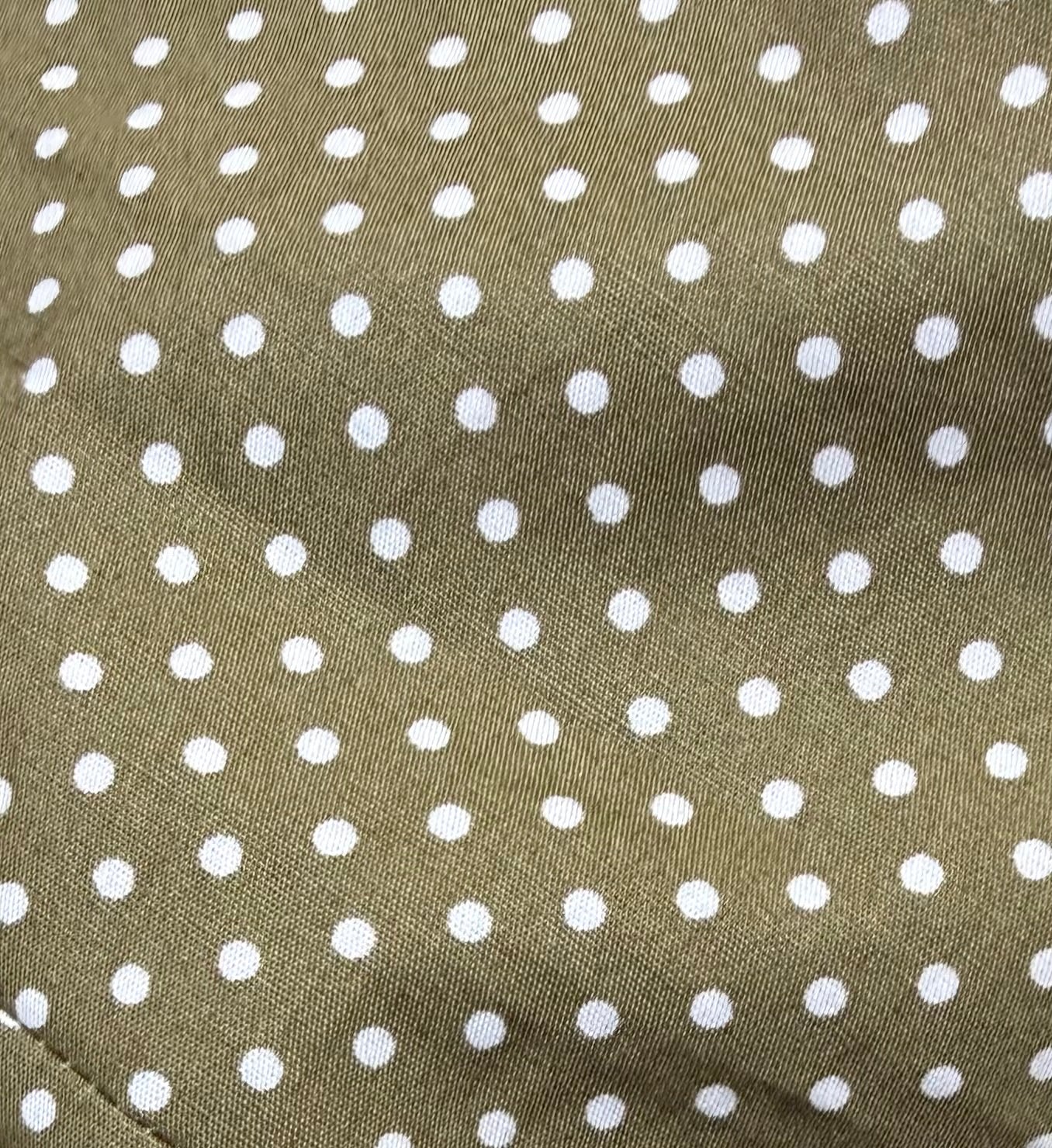 Olive base with white polka dot 100%cotton, wahs at 30 degrees do not tumble dry.