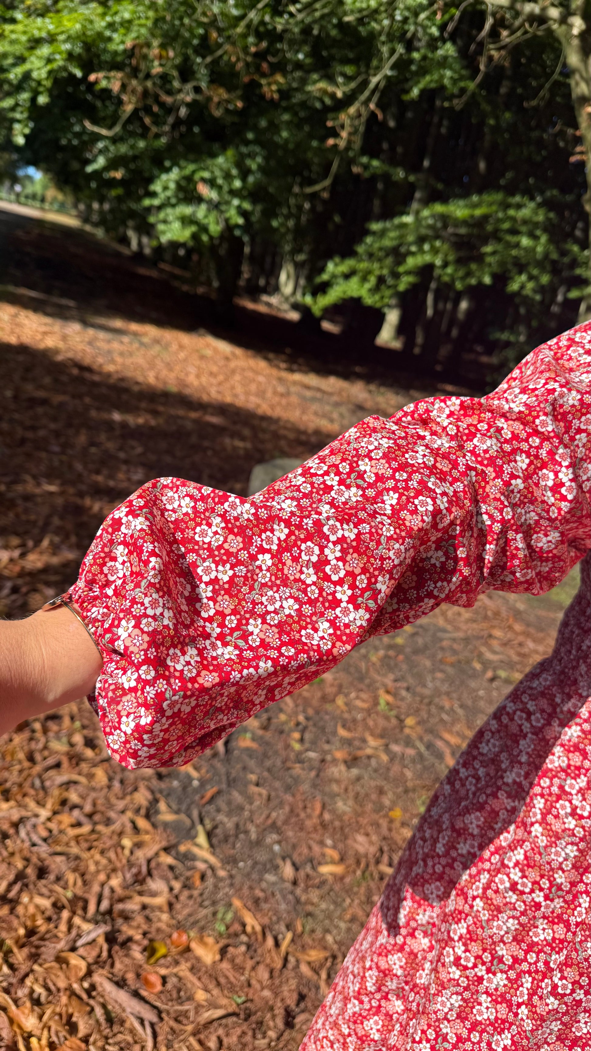 This dress has long bell shaped sleeves with an elastic cuff . It also has a 'v neck' shaped bodice that is double lined so extra support, it also has a self tie bow on the front for extra detail. The back is fully shirred so it's really stretchy and comfy to wear. This is the short length but also available in a midi length, both skirts have pockets.
